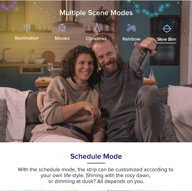 Music Sync Mode: Select a music mode, and the strips will dance to the rhythm of your favorite songs. Immerse yourself in the sweet music and color changing lights.