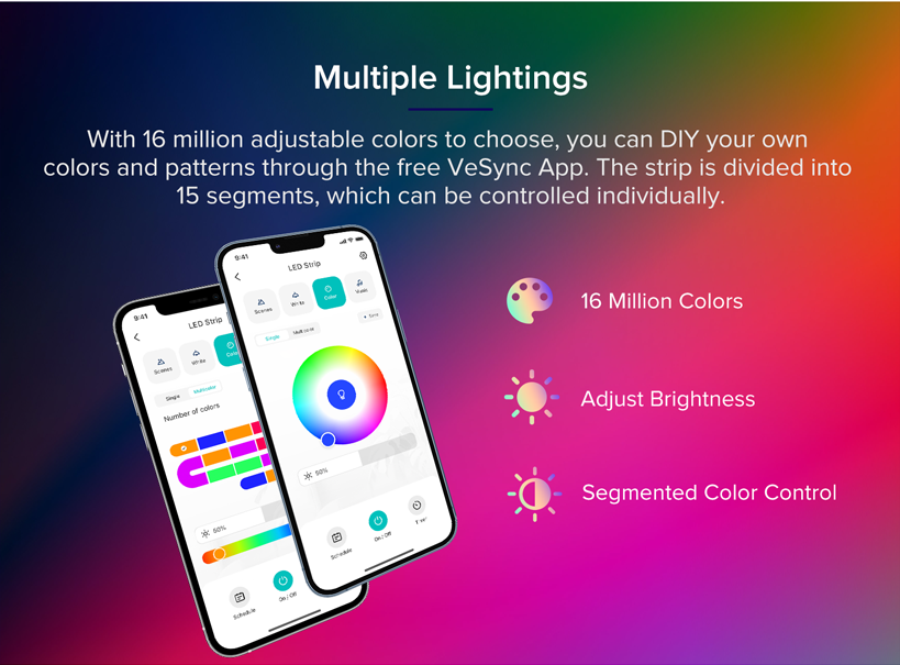 Multiple Lightings: With 16 million adjustable colors to choose, you can DIY your own colors and patterns through the free VeSync App. The strip is divided into 15 segments, which can be controlled individually.