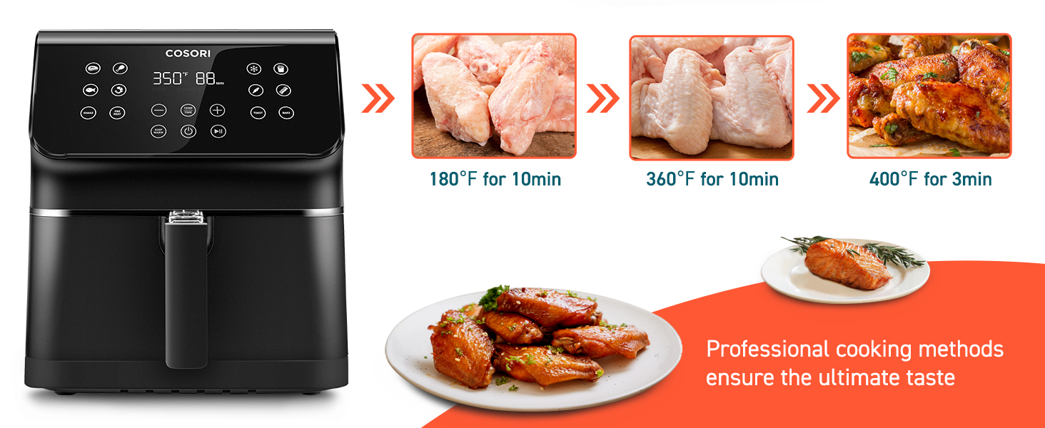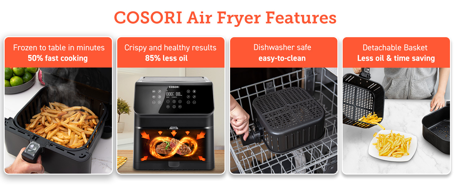 Less Fat: Up to 85% less fat than traditional deep fried foods, same delicious taste.