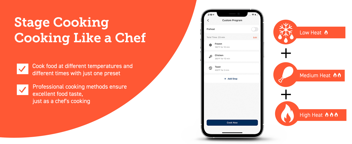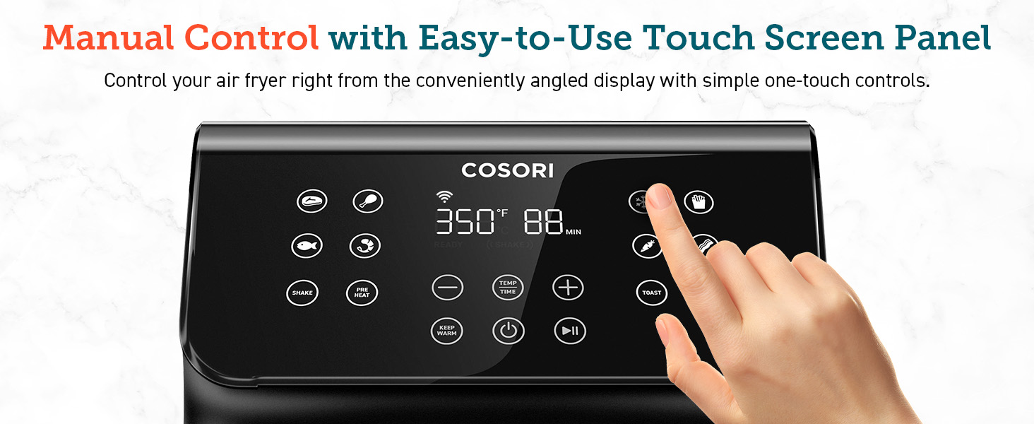 12 Customizable Cooking Functions: Steak | Chicken | Seafood | Shrimp | Frozen Foods | French Fries | Bacon | Vegetables | Toast | Bake | Preheat | Keep Warm