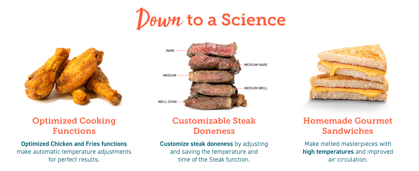 7 Cooking Functions: Preheat, Keep Warm, Chicken, Fries, Bacon, Steak, Veggie.