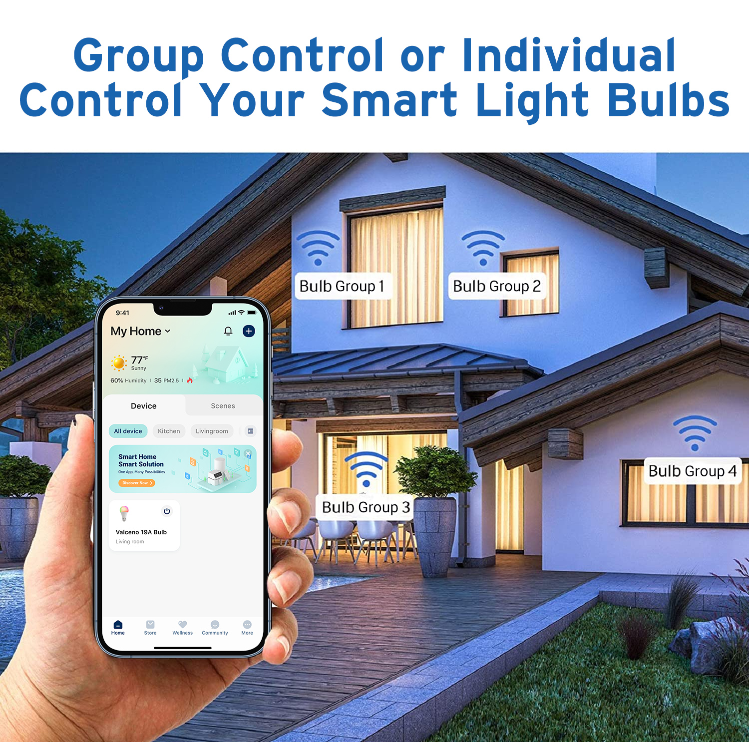 Voice Control: Valceno smart bulb can work with Alexa and Google home assistant; You can easily turn on/off the light, change the light color, and dim the brightness with a simple voice command.