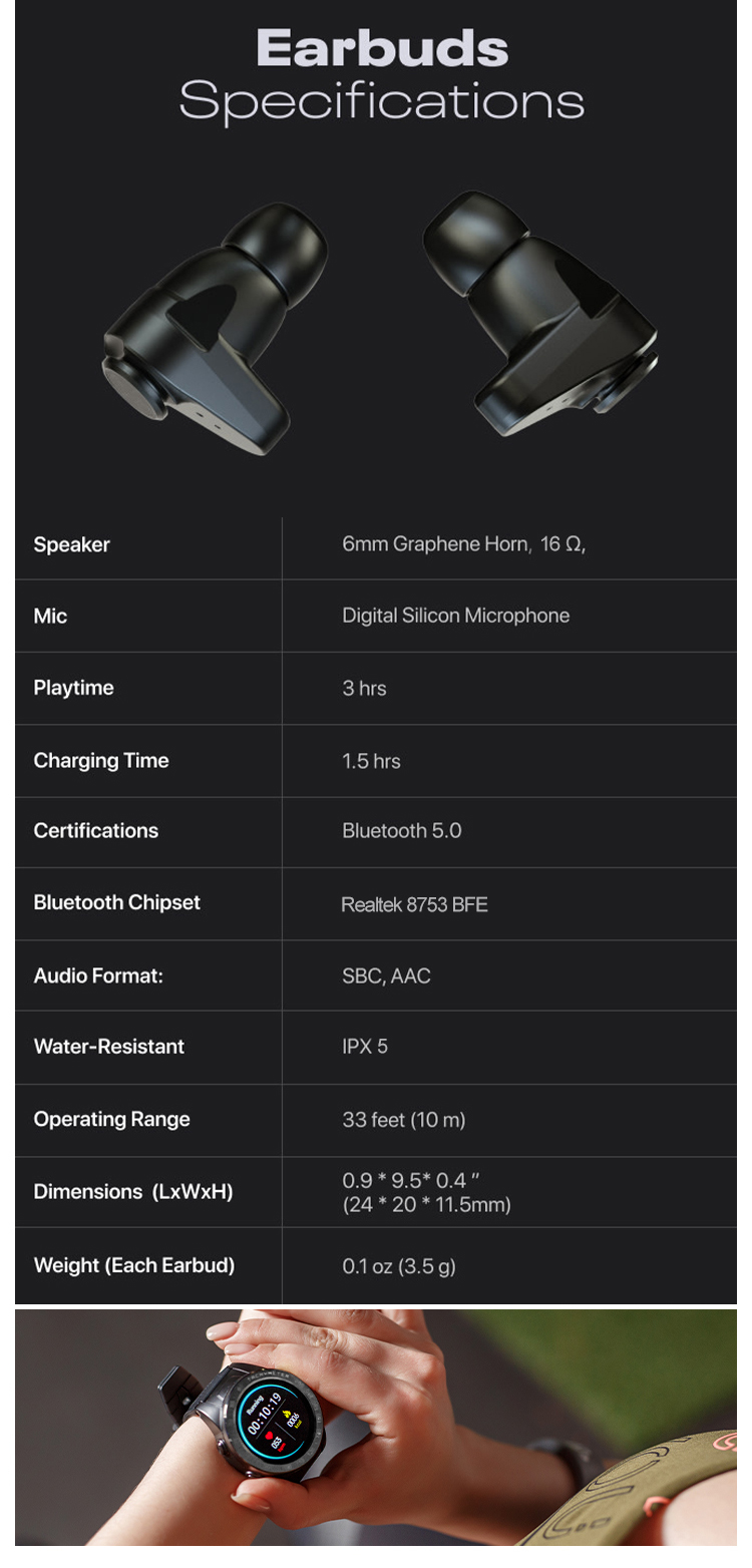 Water-resistant: With IPX7 & IPX5 (Watch IPX7, Earbuds IPX5) Water-resistant, making it a perfect partner for gym workouts, morning runs, yoga meditations and more, without compromising your audio experience.
