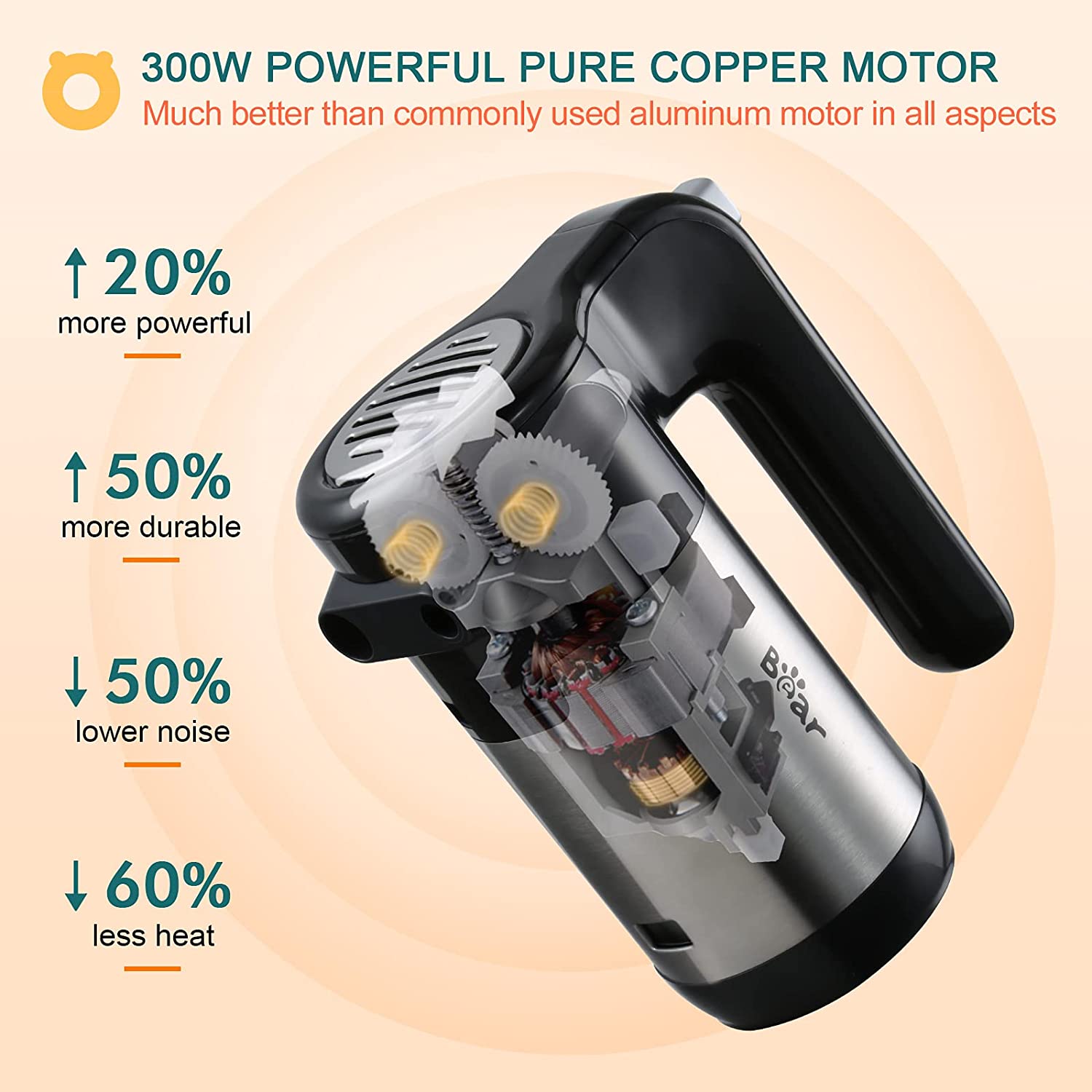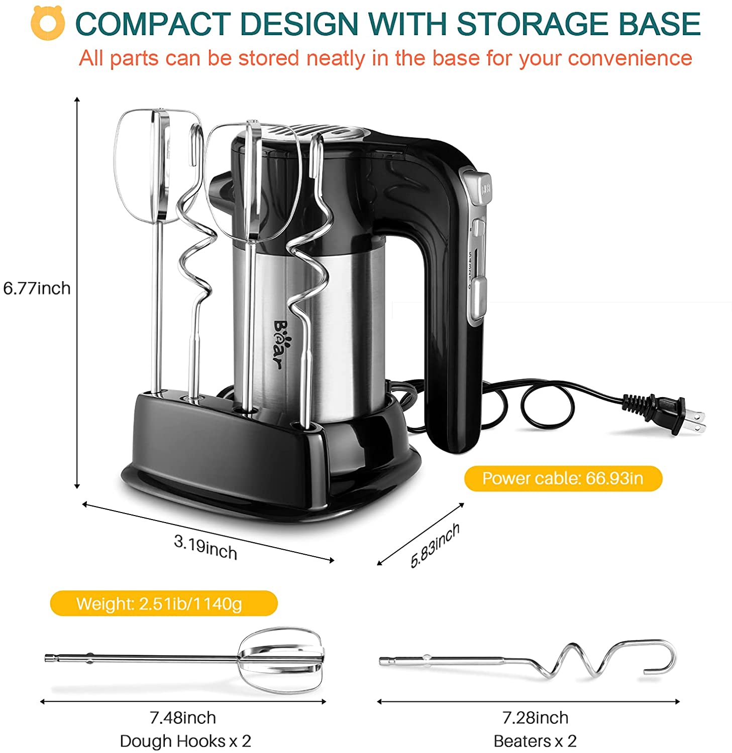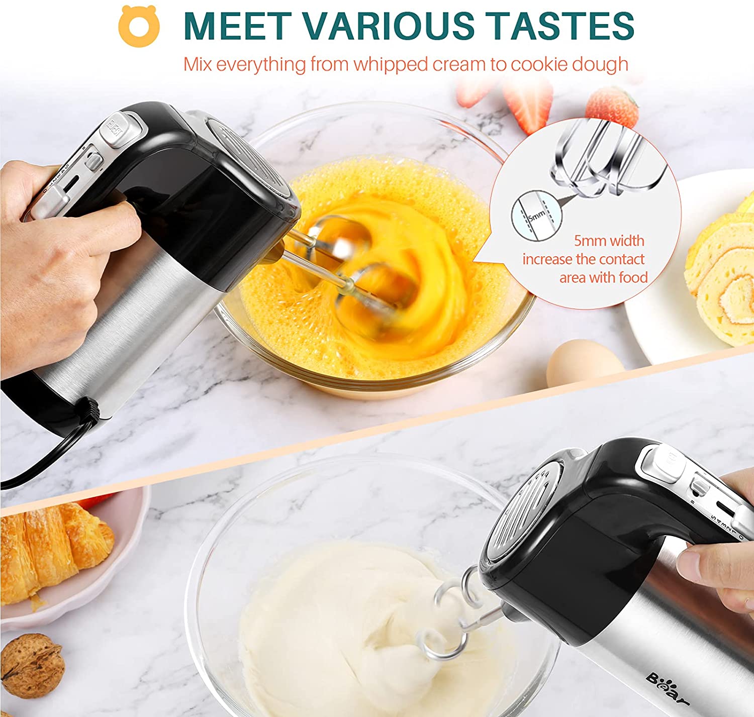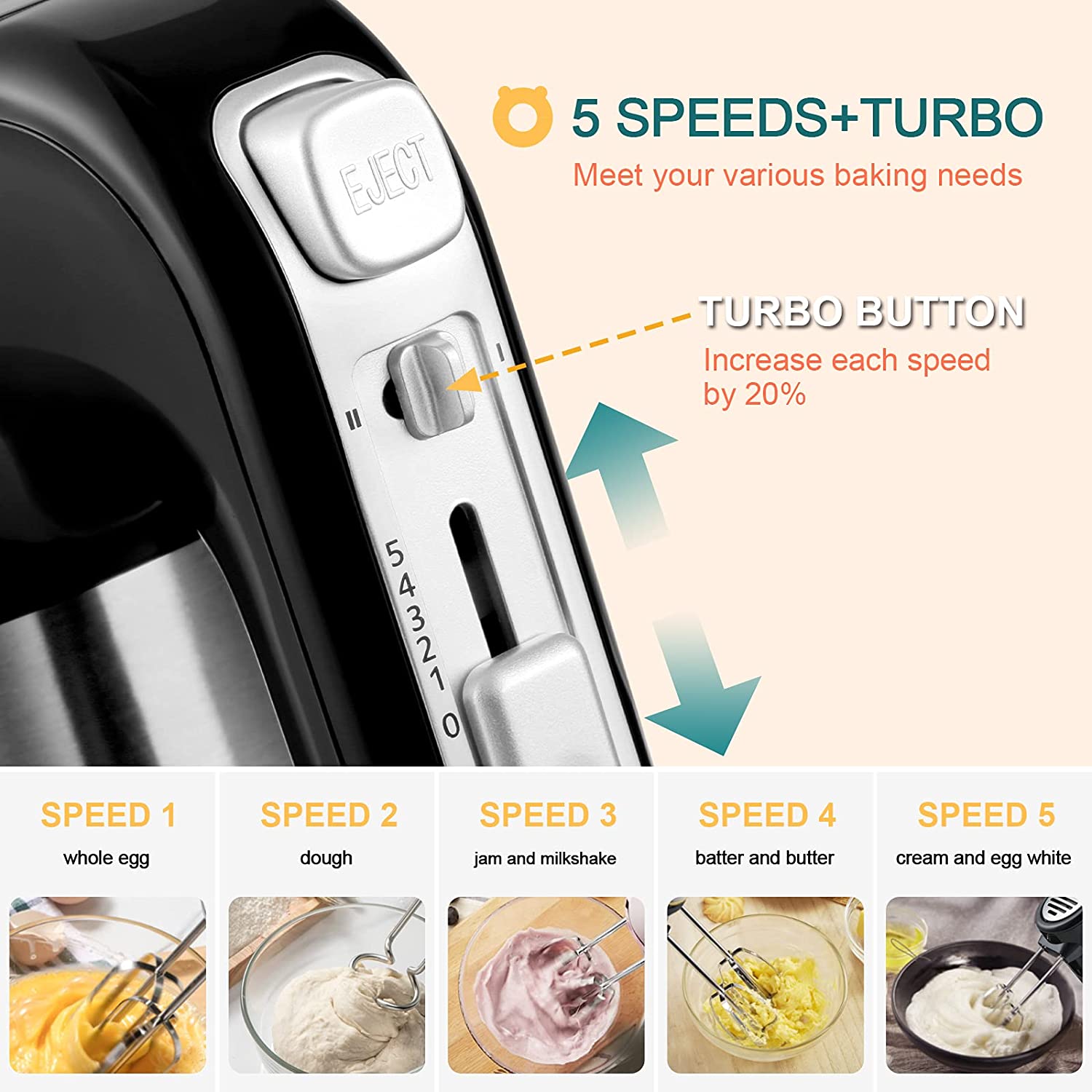 5 Speeds & 300W Powerful Motor: mix dough, eggs, milk, butter, cake or even cream quickly and easily