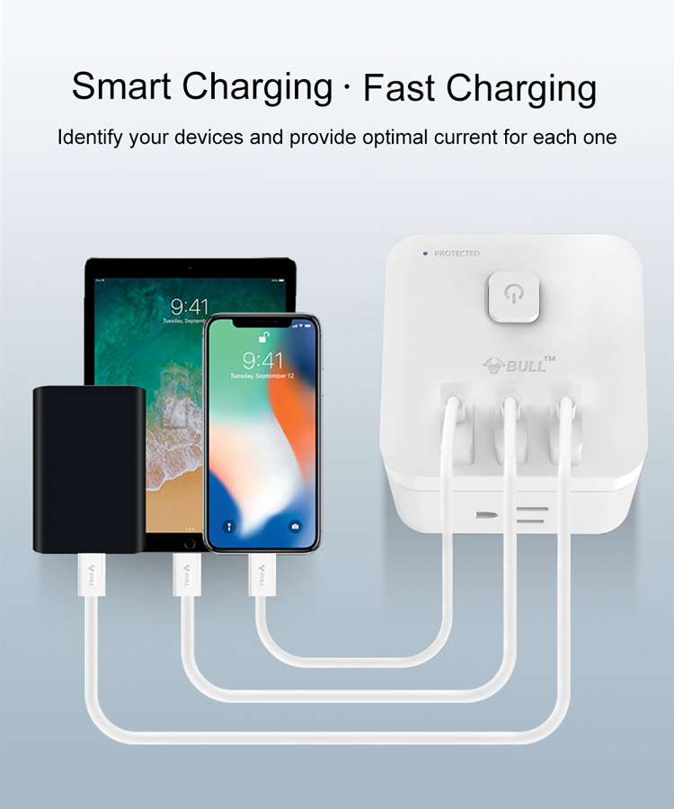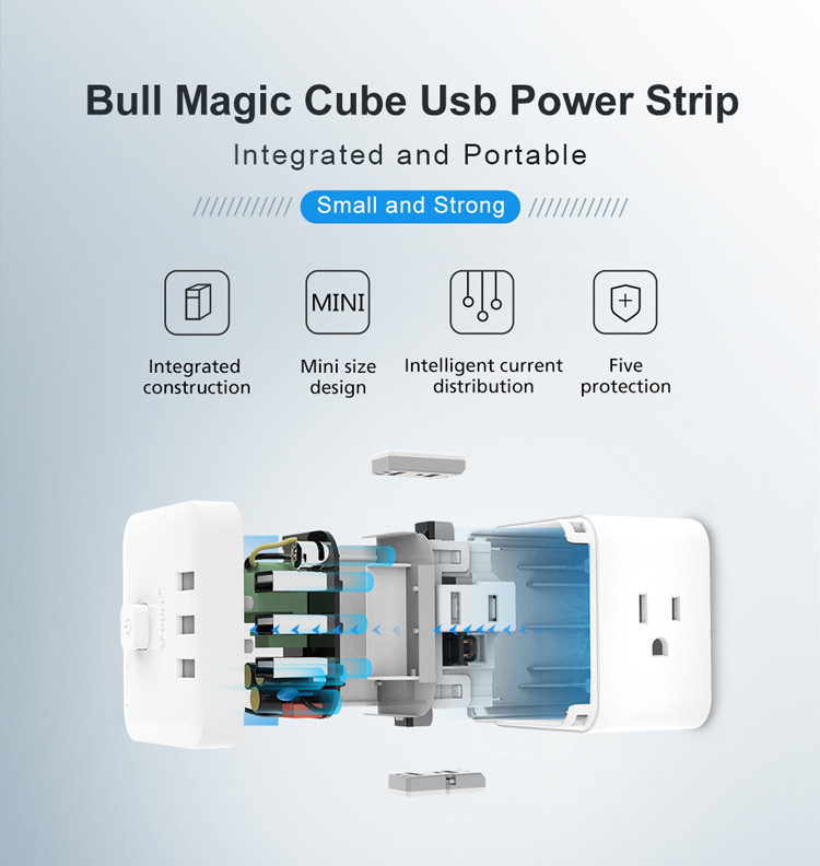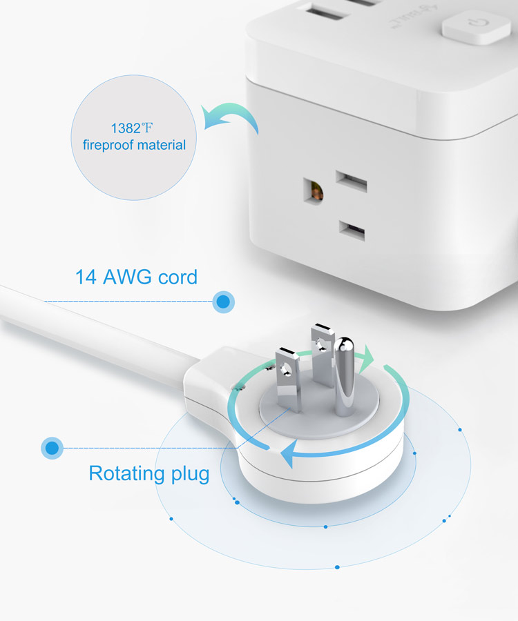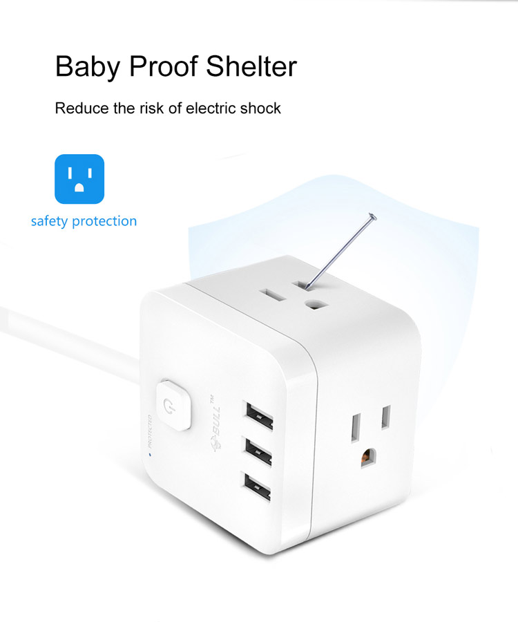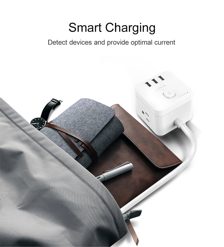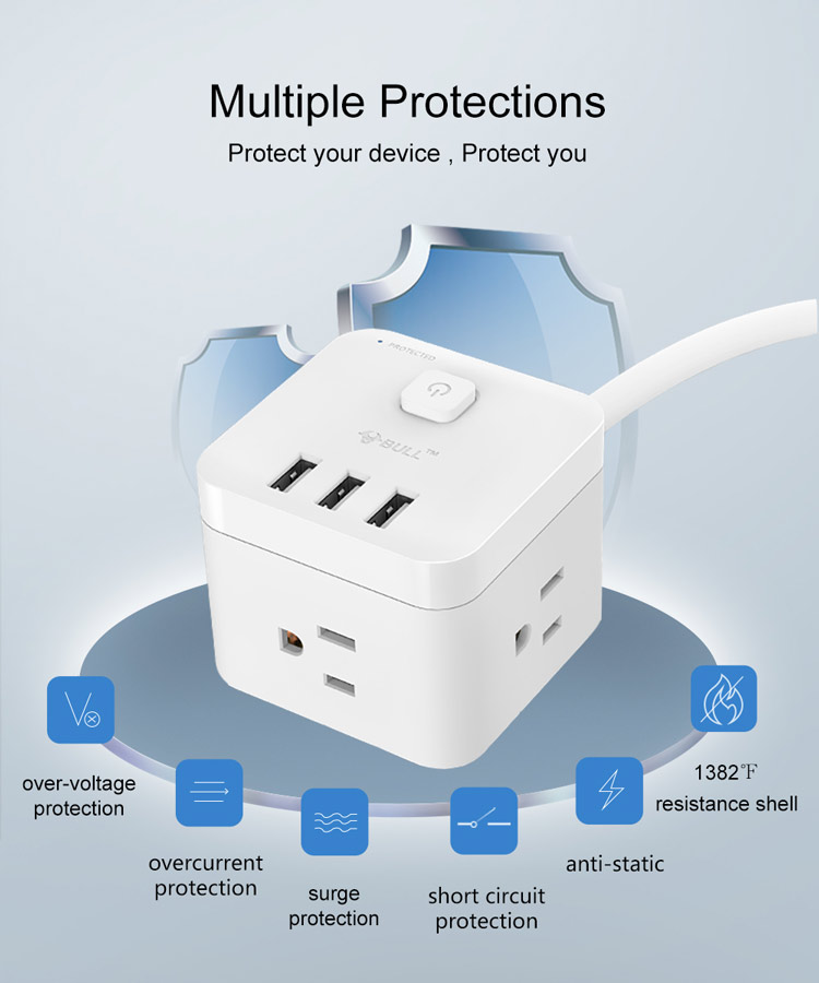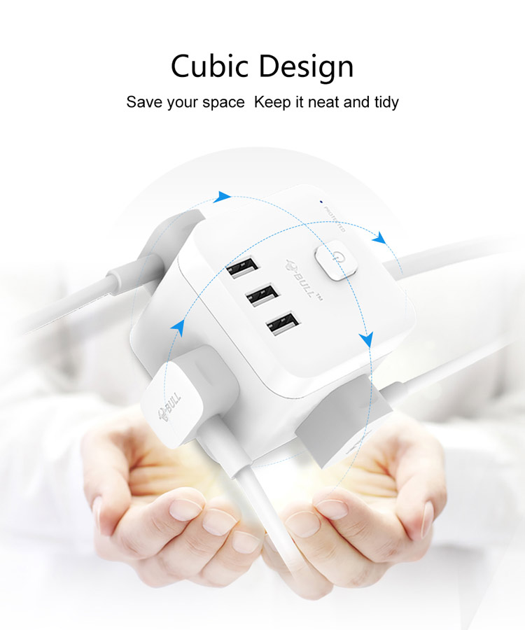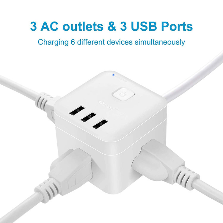 Space-saving cubic design, with 3 AC outlets and 3 USB ports power, 360° rotating flat plug