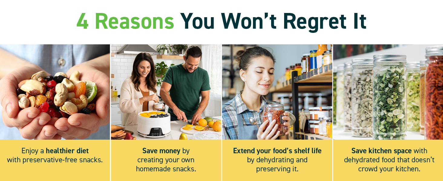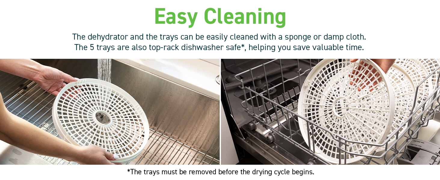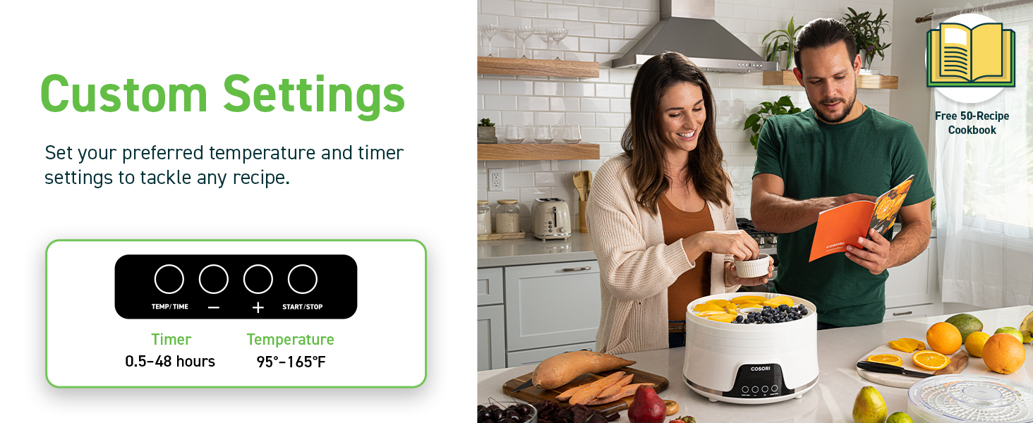 Adjustable: Thermostat: Dry foods at just the right temperature, between 95°–165°F.
