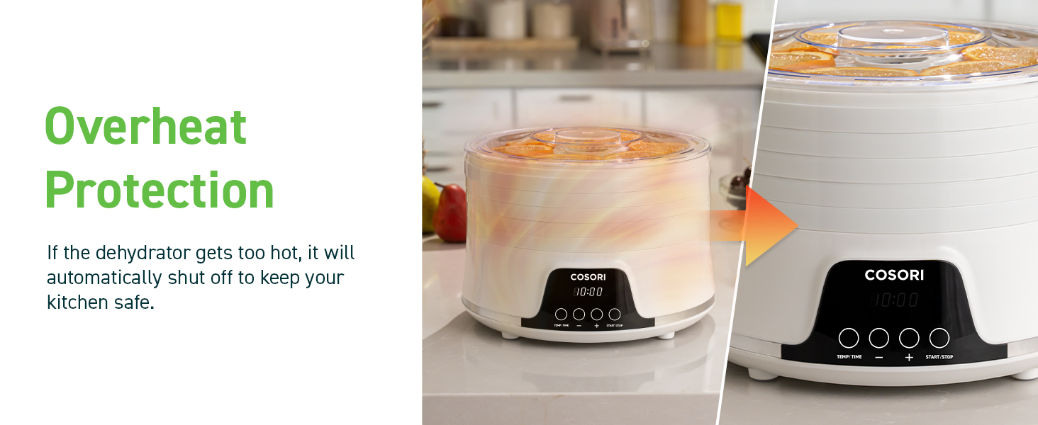 Safety Features: Overheat protection will activate if the dehydrator overheats.