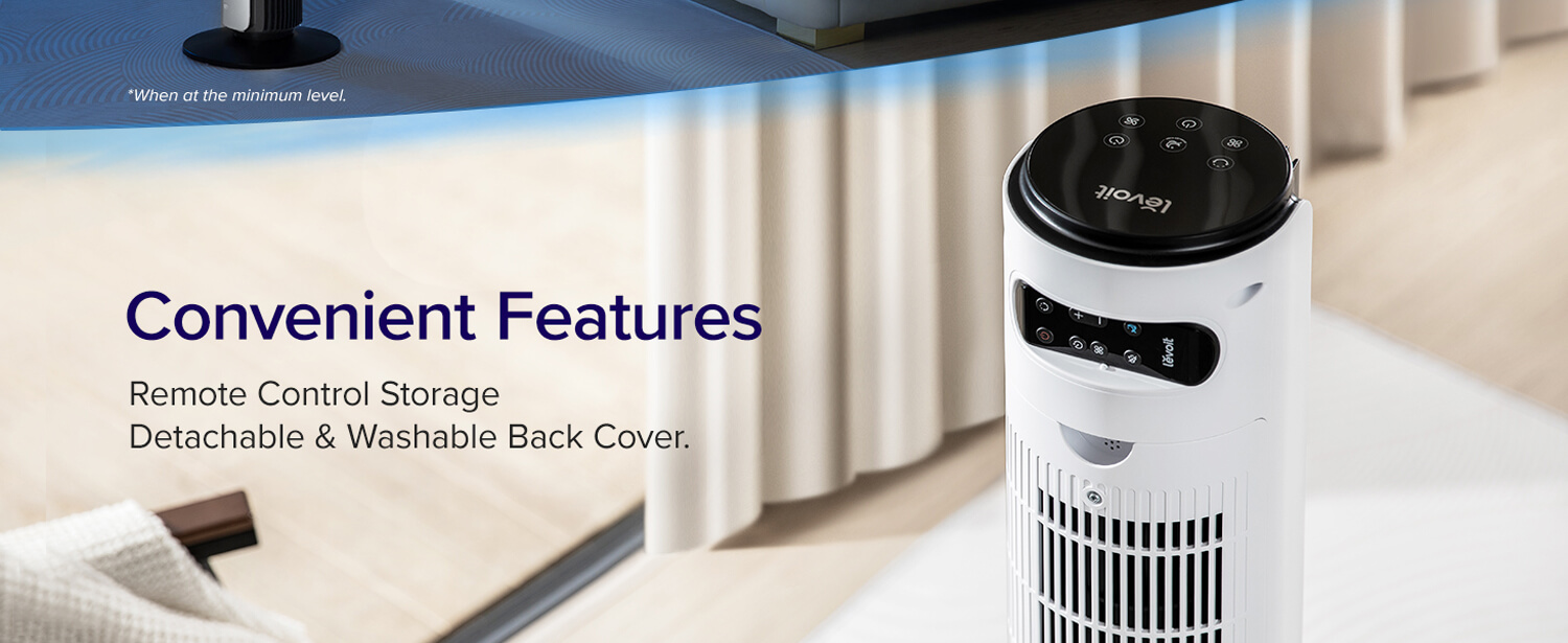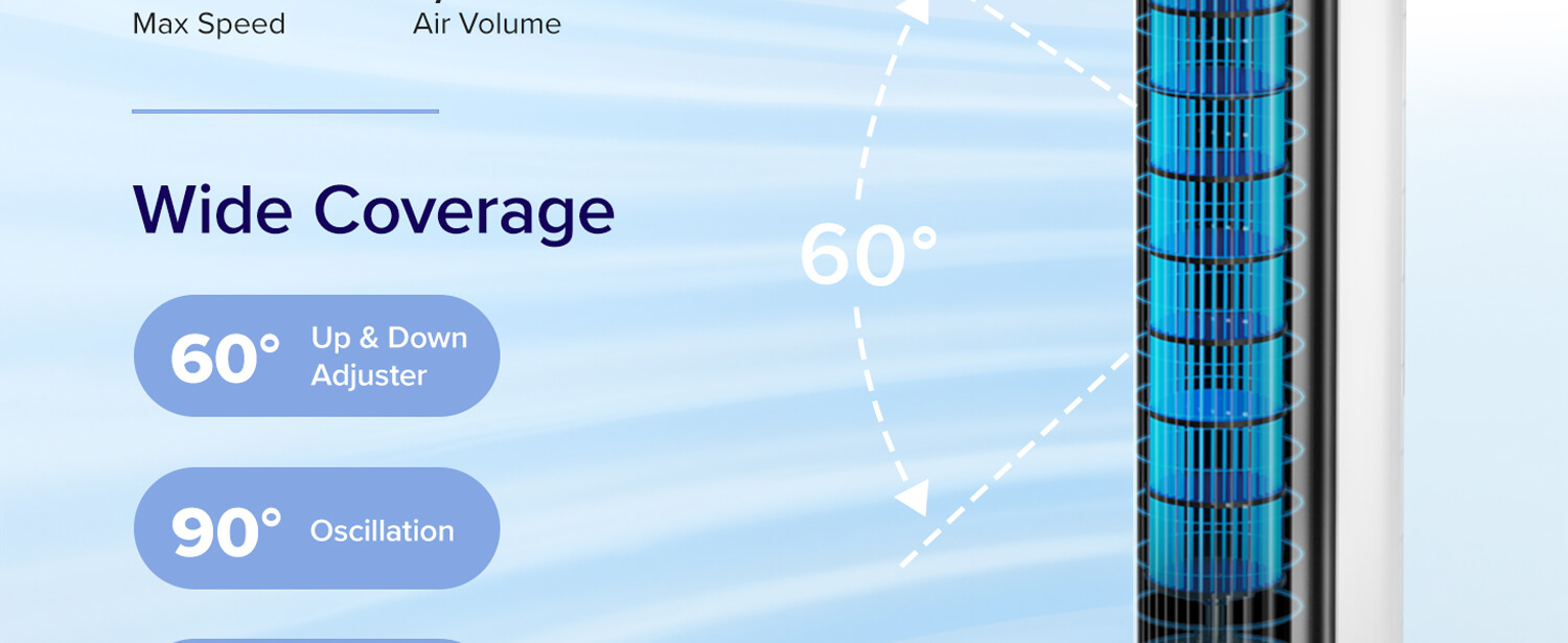 Wide Coverage: The tower fan’s optional 90° oscillation and 60°up & down adjuster provides a wider coverage.