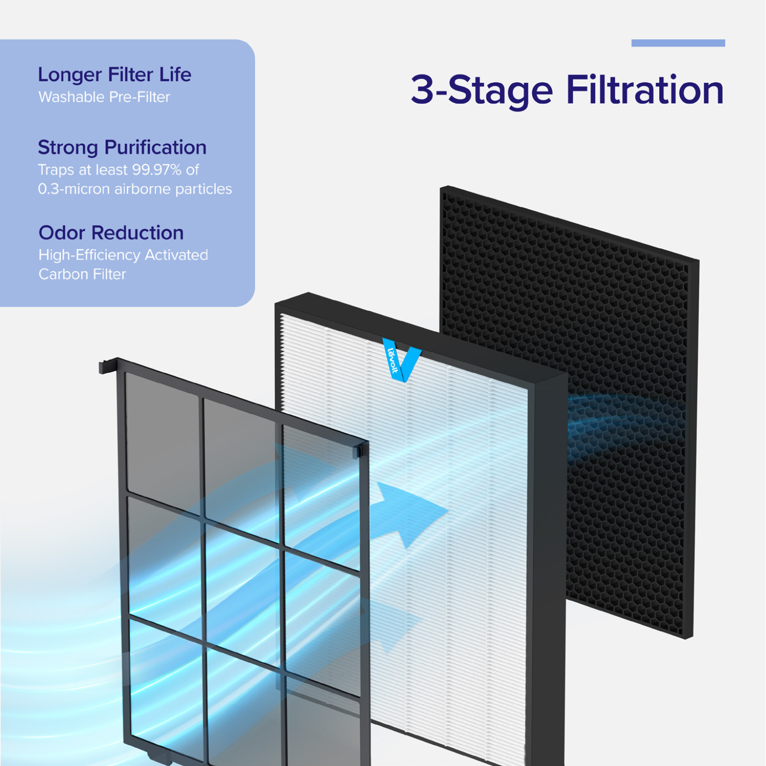 3-Stage Filtration: The Main Filter traps pet dander, pollen, and more, while the High-Efficiency Activated Carbon Filter helps neutralize pet odors, fumes, and VOCs.